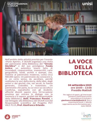 Un’occasione preziosa per entrare in dialogo con la memoria e il sapere, guidati dal Responsabile della Biblioteca, Dott. Francesco Poesini, e dal Delegato alla Biblioteca del DGIUR nonché Responsabile scientifico del Progetto POT VALE PLUS, Prof. Gianfranco Orlando.